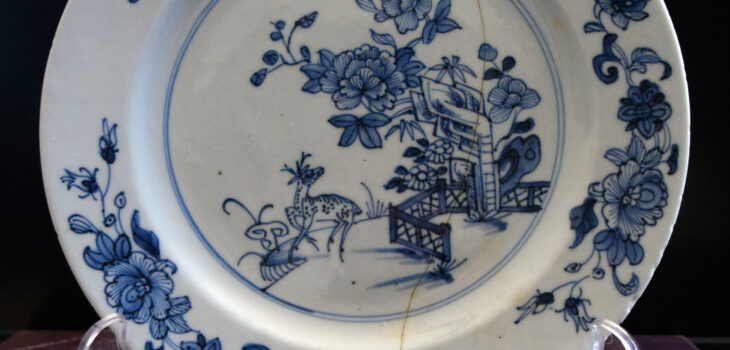 A Late k’ang hsi (Kangxi) plate showing a small deer next to a garden fence. The deer represents prosperity so a popular subject for Chinese Dinner ware. It is also the main route to finding immortality as the deer is supposed to be the only animal that can find Lingzhi (aka reishi) the “mushroom of immortality”. This means that the deer can also be used to represent longevity.
