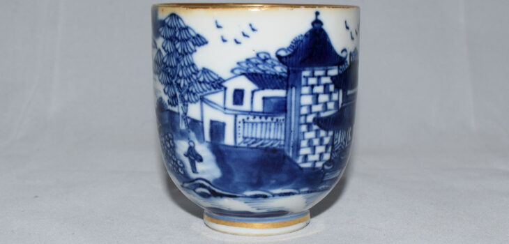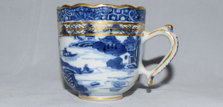 A mid to late Eighteenth Century Chinese Export Porcelain Coffee Cup / Can – with an interesting wavy rim. Blue and white – the soft honey gold European gilding (most likely done in London around 1800) sets off the rim. The hand-painted underglaze blue building is similar to those copied from the Chinese by Spode to create the later Temple and Broseley Patterns
